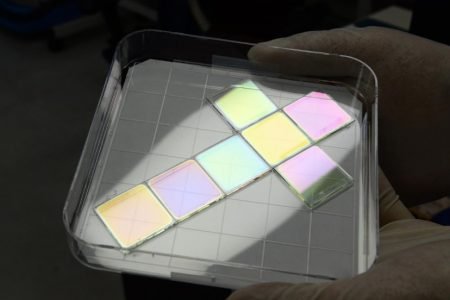 These photovoltaic cells come in seven different slightly fluorescent colors, including pink, yellow, purple, green, and blue, without having to go through any additional process. These give them a remarkable appearance unlike the monotonous navy blue on standard solar cells, while cutting down on production costs.